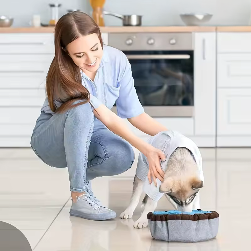 Denna snufflematta gör måltiden till en rolig och utmanande aktivitet för din hund. Godis eller torrfoder göms enkelt i mattans lager, vilket uppmuntrar hunden att nosa och leta för att bli stimulerad.