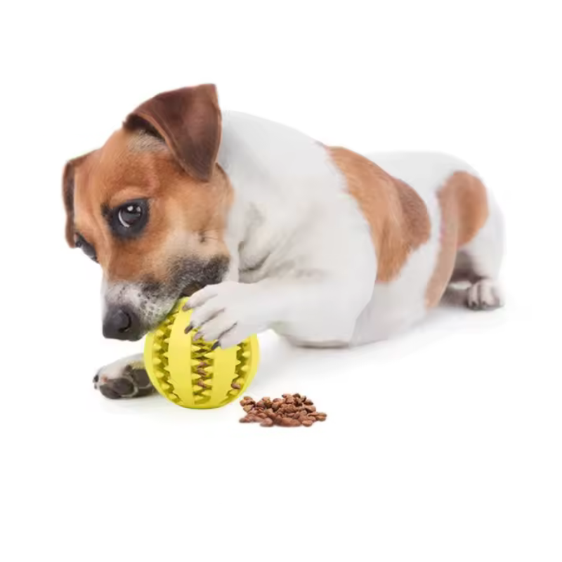 Denna Tand-boll är både en leksak och ett smart hjälpmedel för din hunds tandhälsa. Bollen kan fyllas med små godisbitar eller torrfoder, vilket gör den extra lockande och stimulerar hunden att leka längre. Samtidigt hjälper de mjuka, räfflade kanterna till att rengöra tänderna och massera tandköttet när hunden tuggar på bollen.